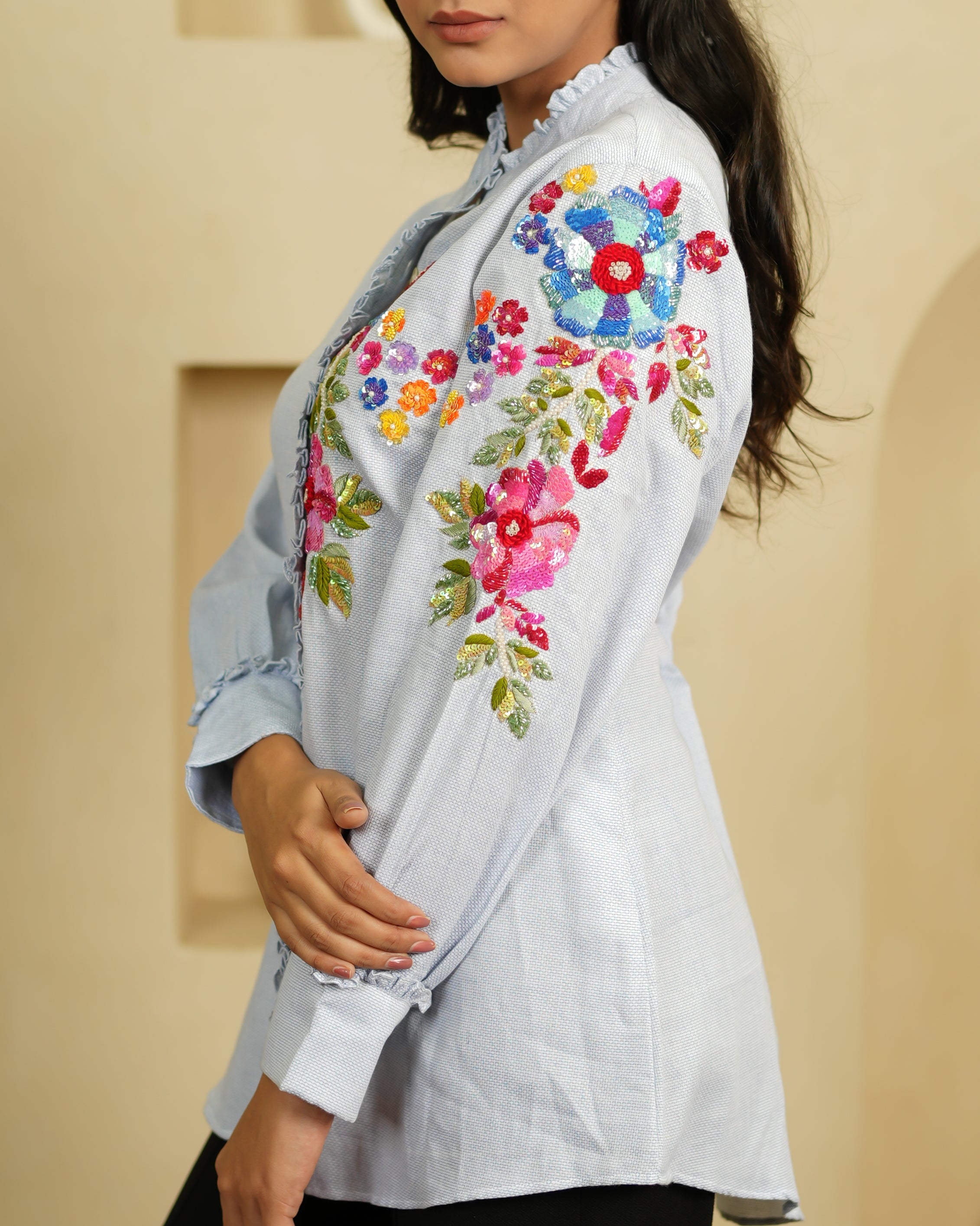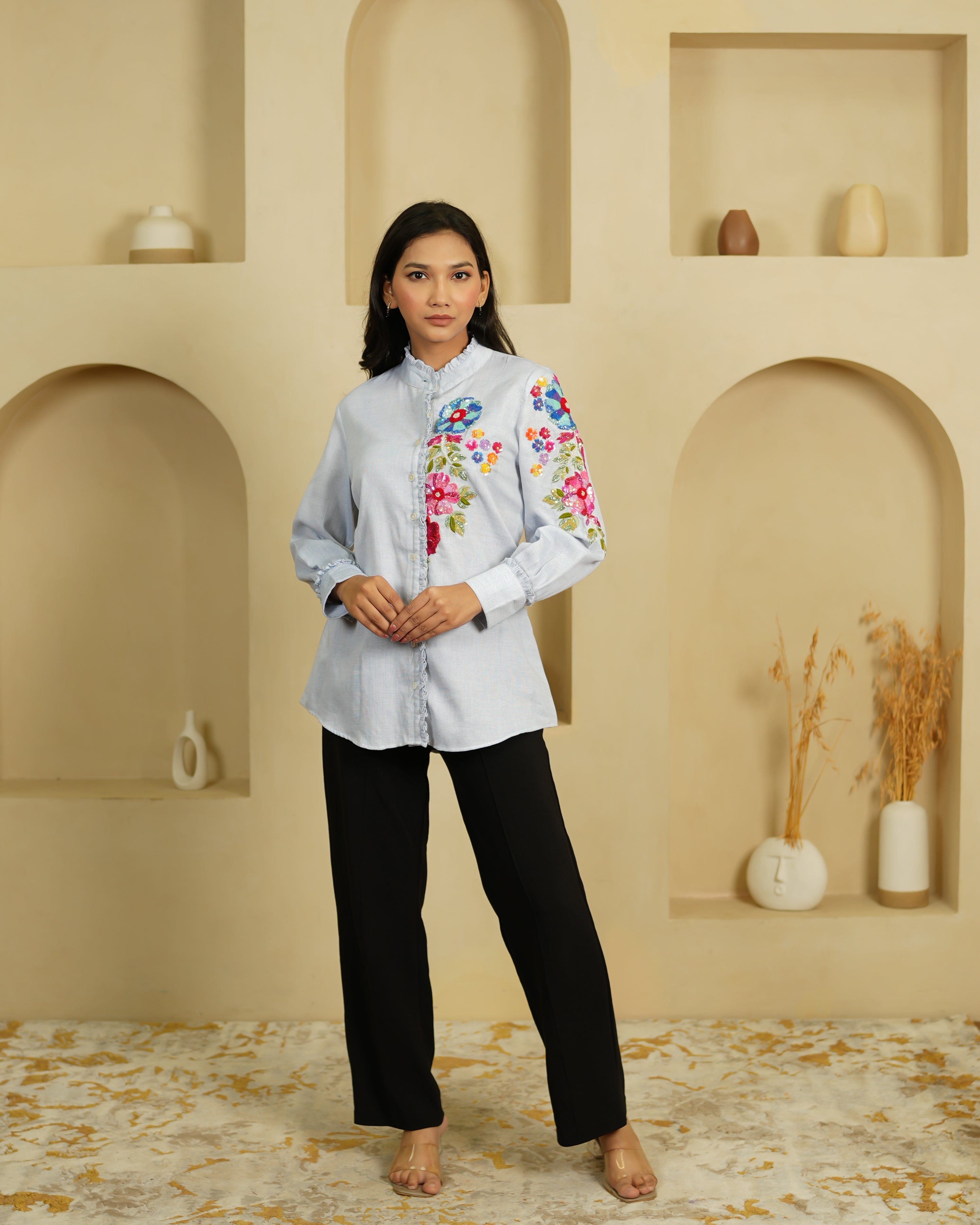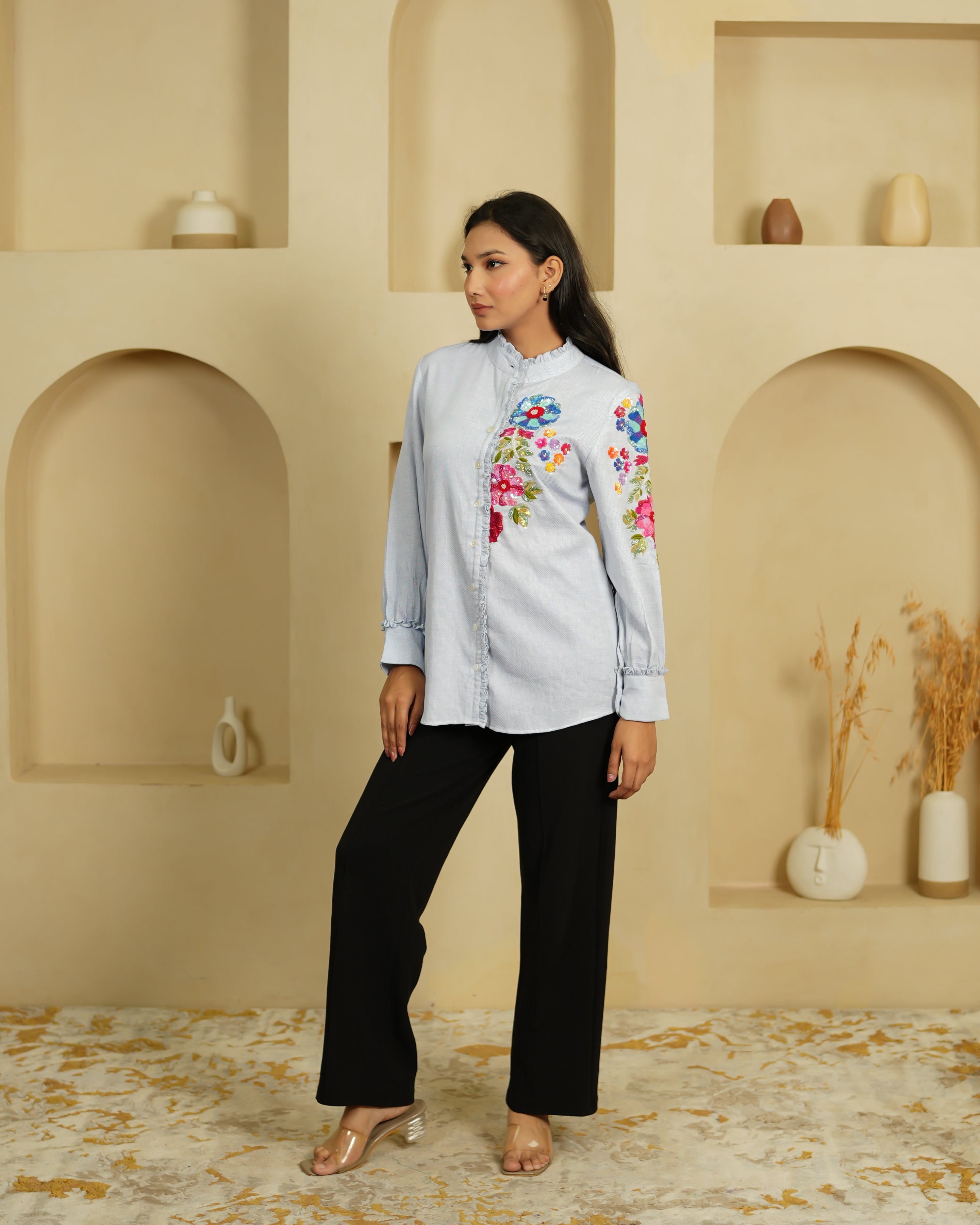 Joyful, vibrant, and unapologetically colourful — the Bunch is a co-ord set that celebrates maximalism in the best possible way. The light blue organza shirt is covered in large, bold floral embroidery in red, orange, blue, pink, and green — it's a riot of colour that somehow works together perfectly. The frilled collar and ruffle details at the cuffs add a playful, vintage charm.