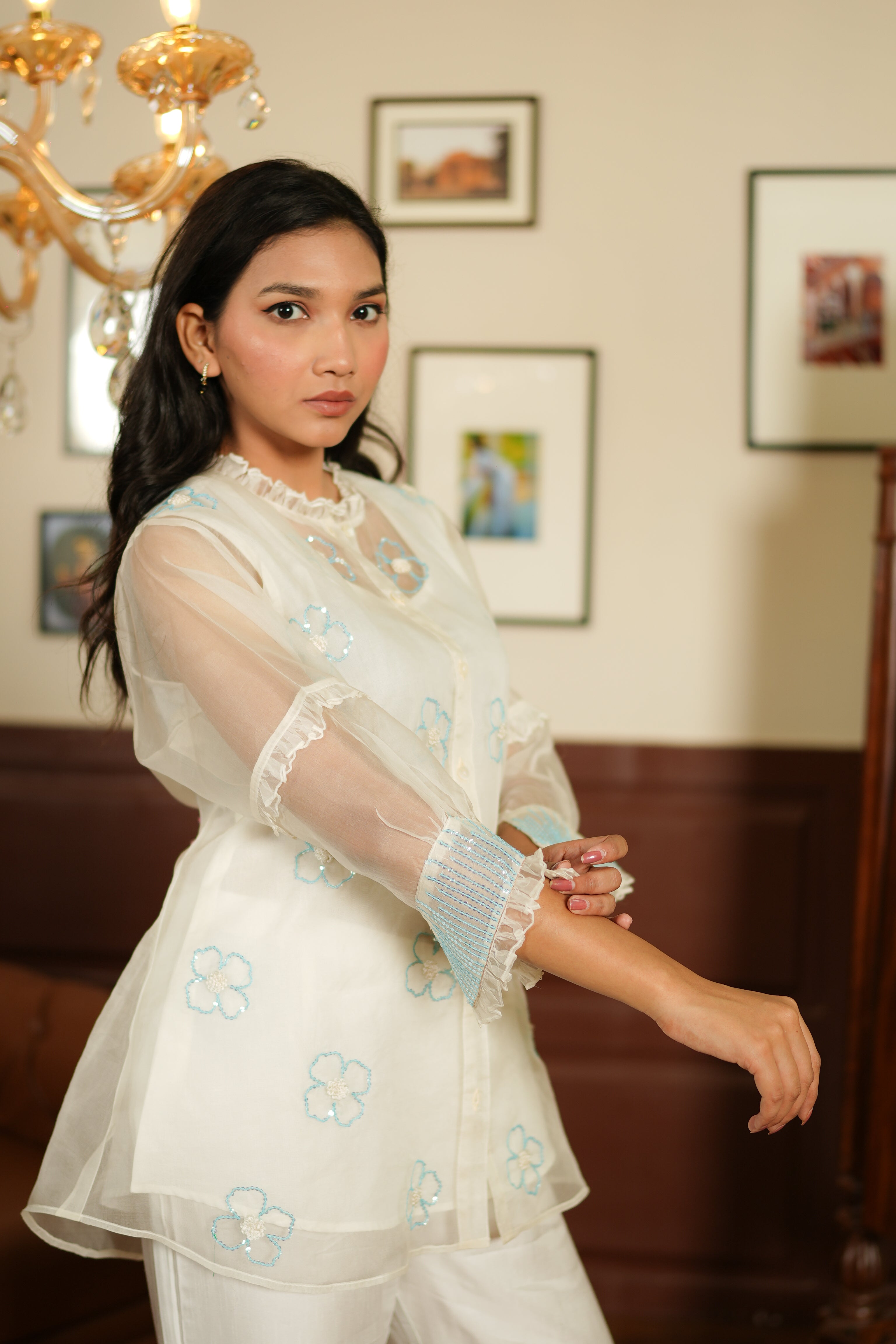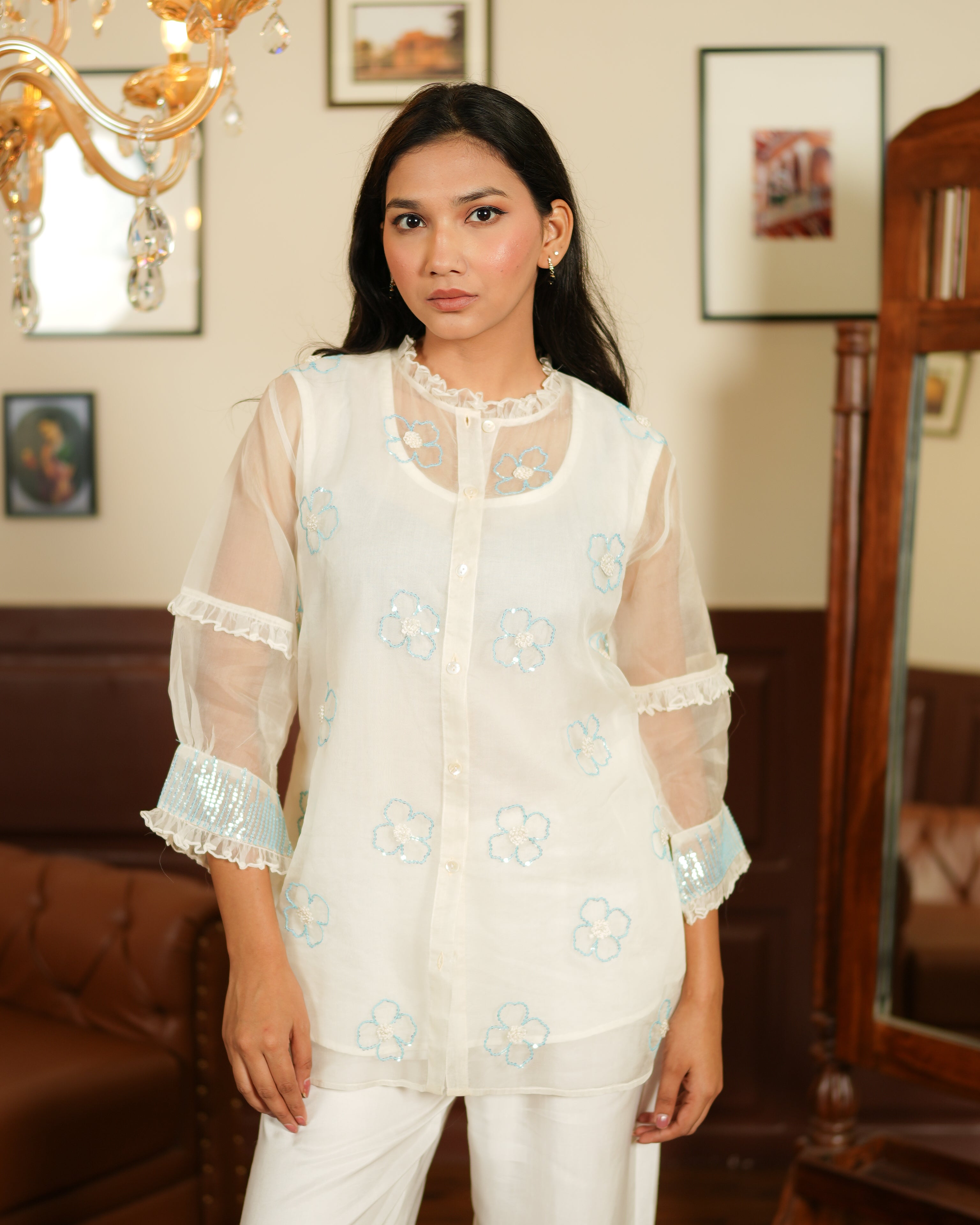 Ethereal, pure, and quietly breathtaking. Snowflakes is a white-on-white co-ord set that proves sometimes less is truly more. The ivory organza shirt is embroidered with delicate floral and leaf motifs in tonal white thread, creating a stunning tonal texture that you only fully appreciate up close. Pearl accents add just the right amount of shimmer. Paired with structured white satin trousers, it's a complete, cohesive look.