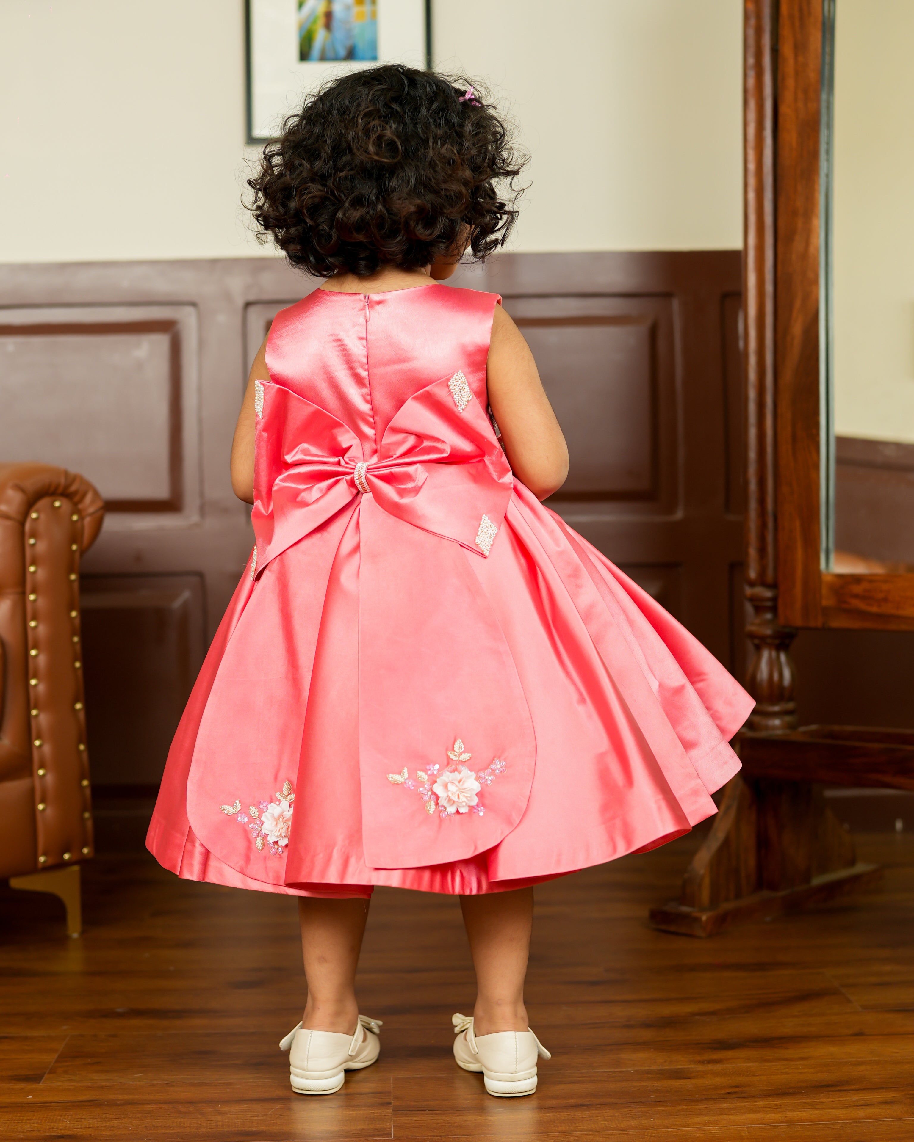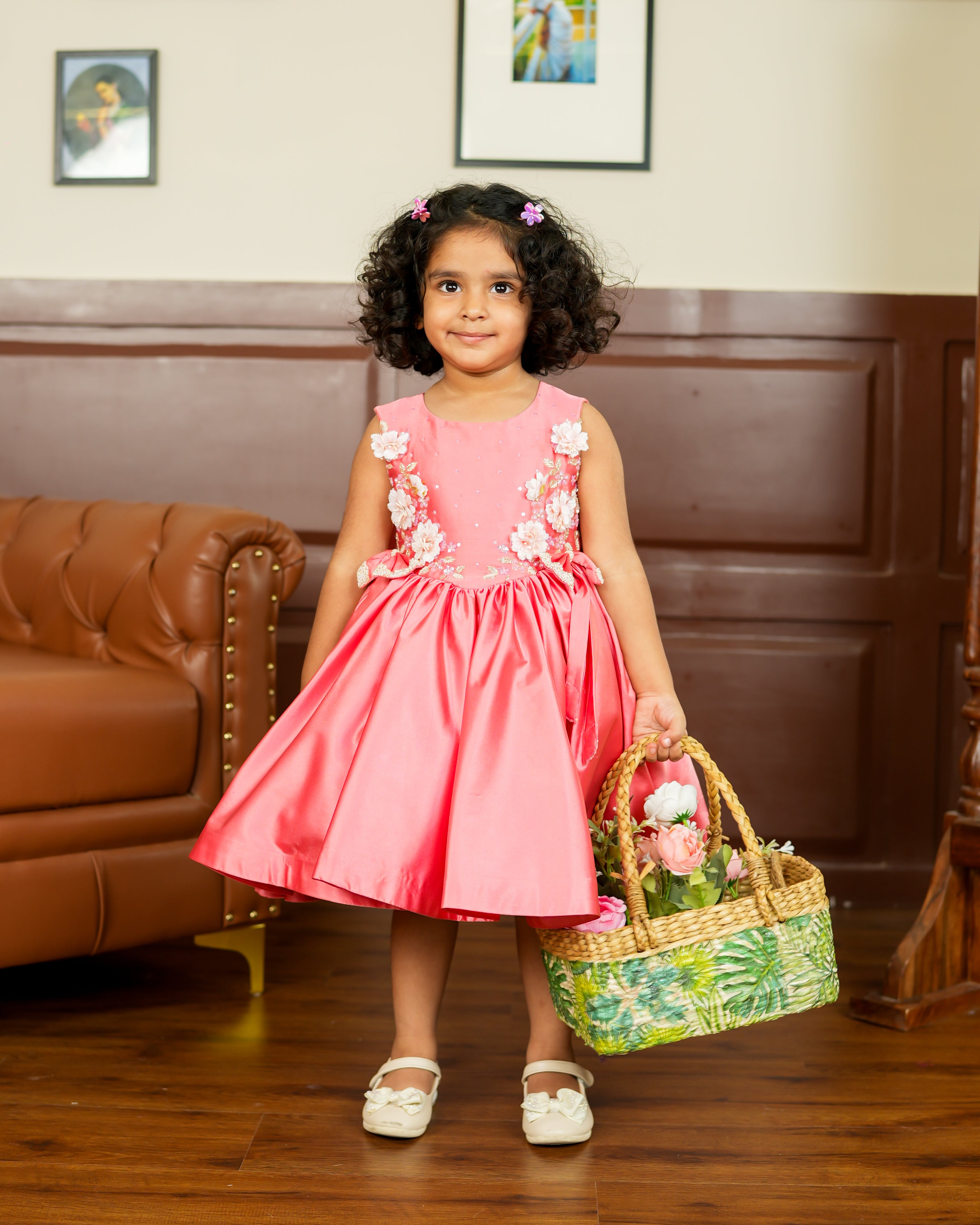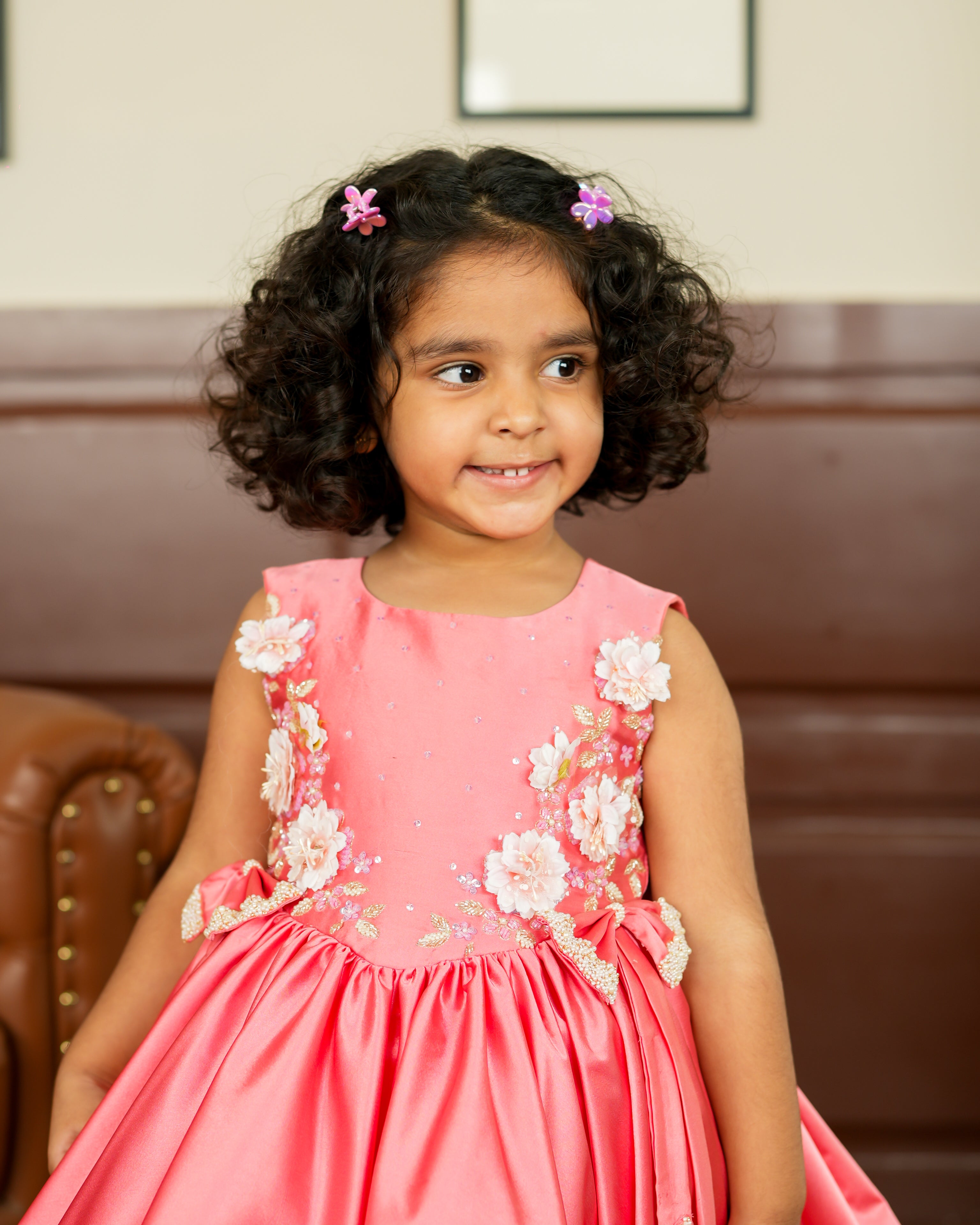 Bright, cheerful, and full of charm, the Carnation Bloom Twirly Tutu Dress is made for moments worth celebrating. Styled in a warm coral shade, this dress adds a lively yet elegant touch to your little one’s party look. The smooth satin fabric with a soft lining ensures comfort while keeping the silhouette beautifully structured.
