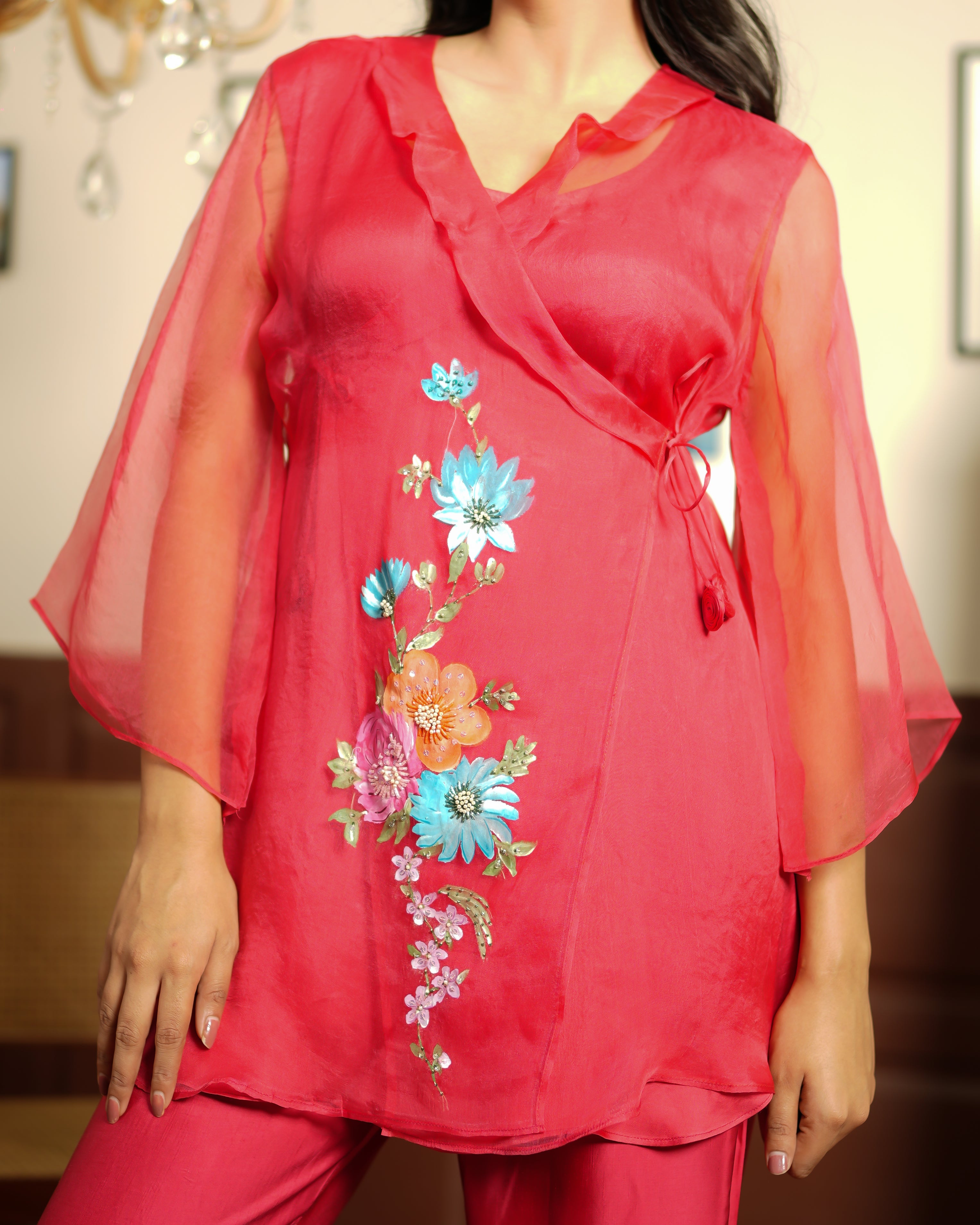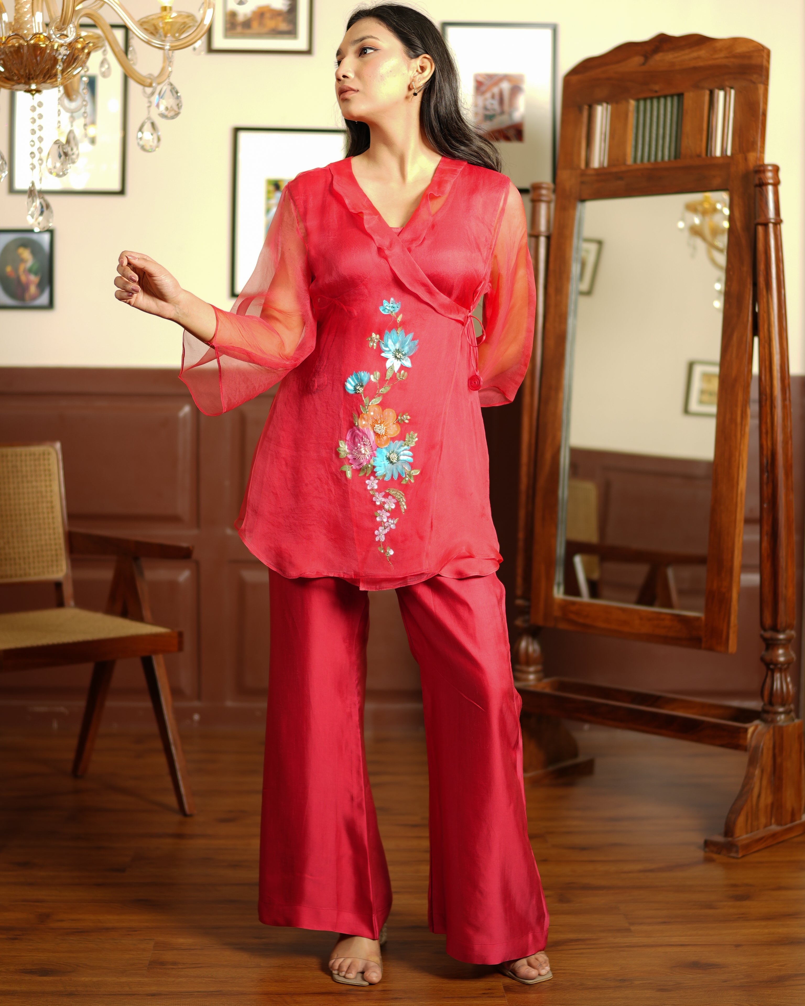 Bold, confident, and full of life — Cherry Blossom is a co-ord set that turns heads. The deep rose organza shirt features a dramatic wrap-style silhouette with colourful embroidered blooms in teal, orange, and pink running down the front. It's matched with flared satin trousers in the same rich rose tone, making it a full, head-to-toe statement.