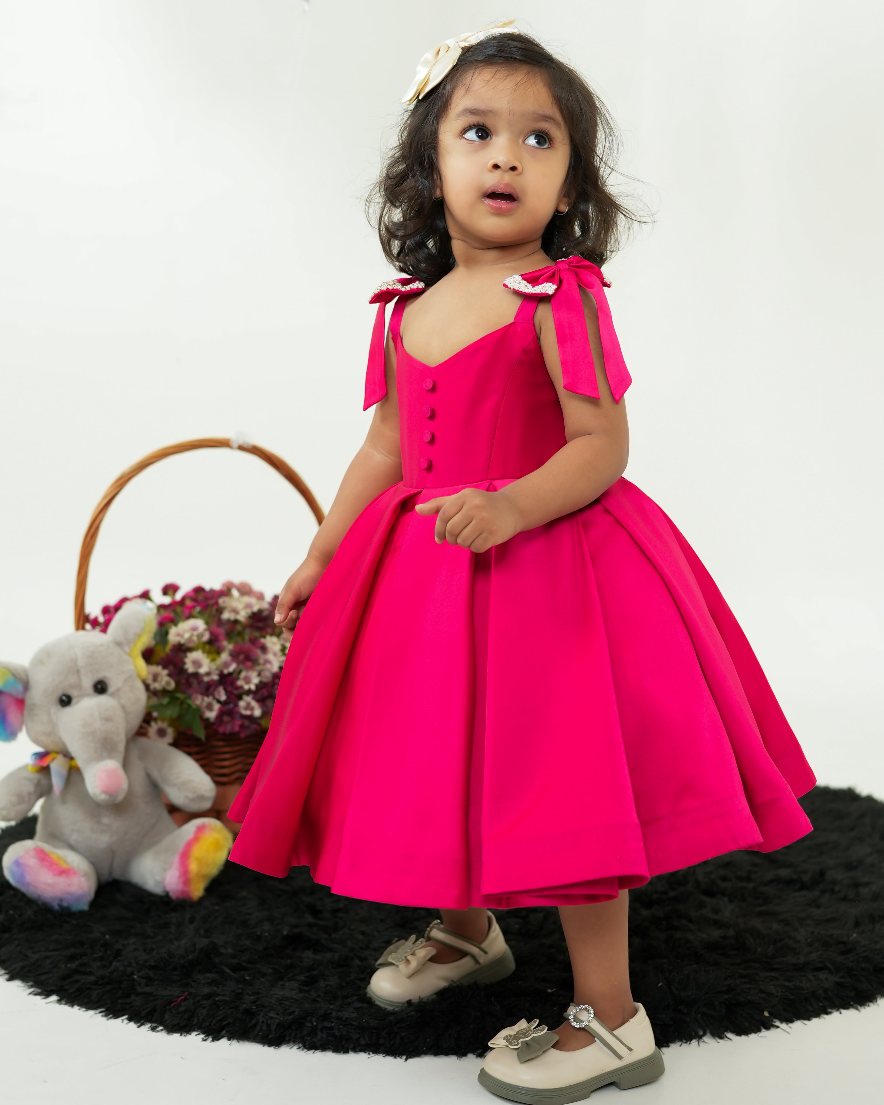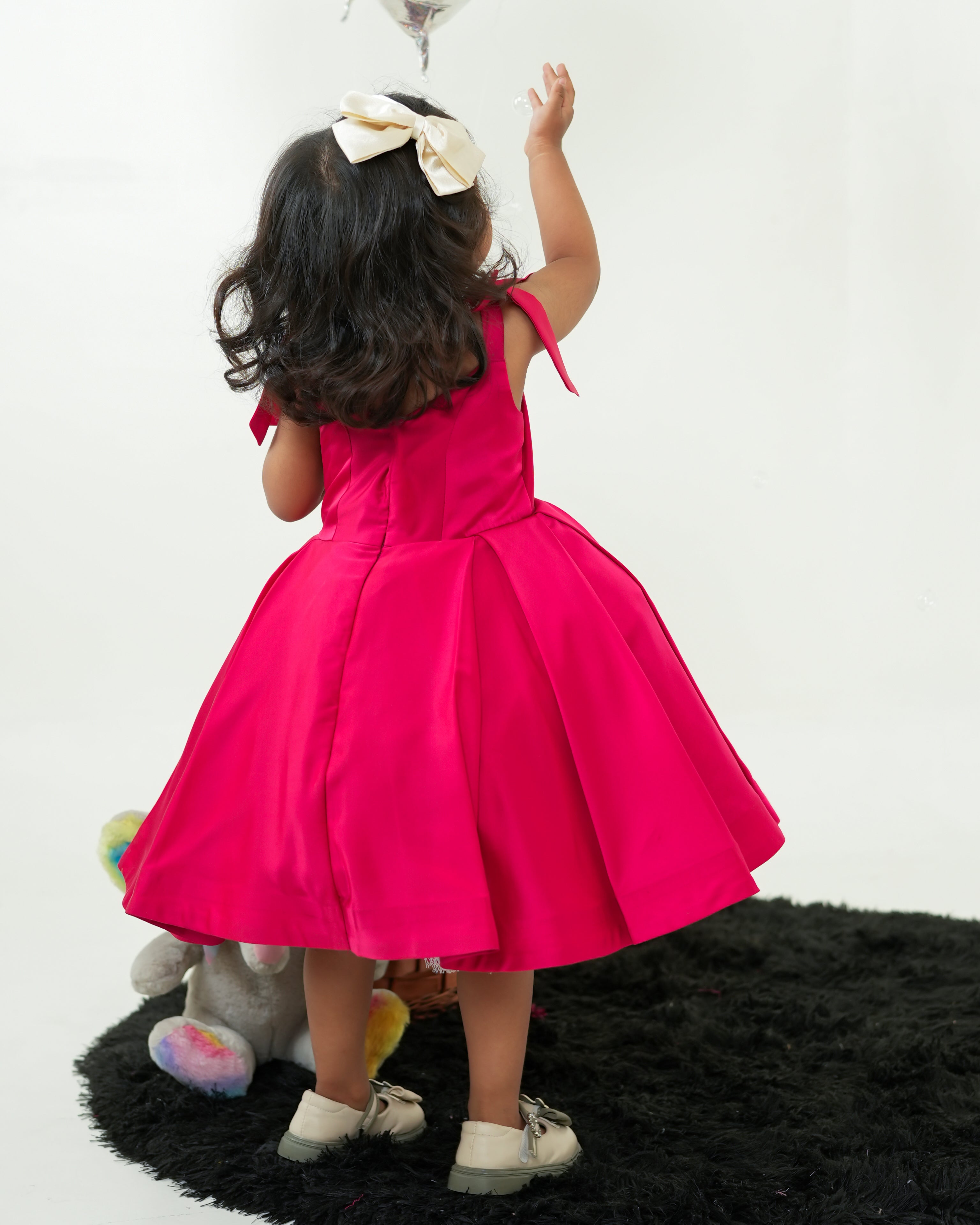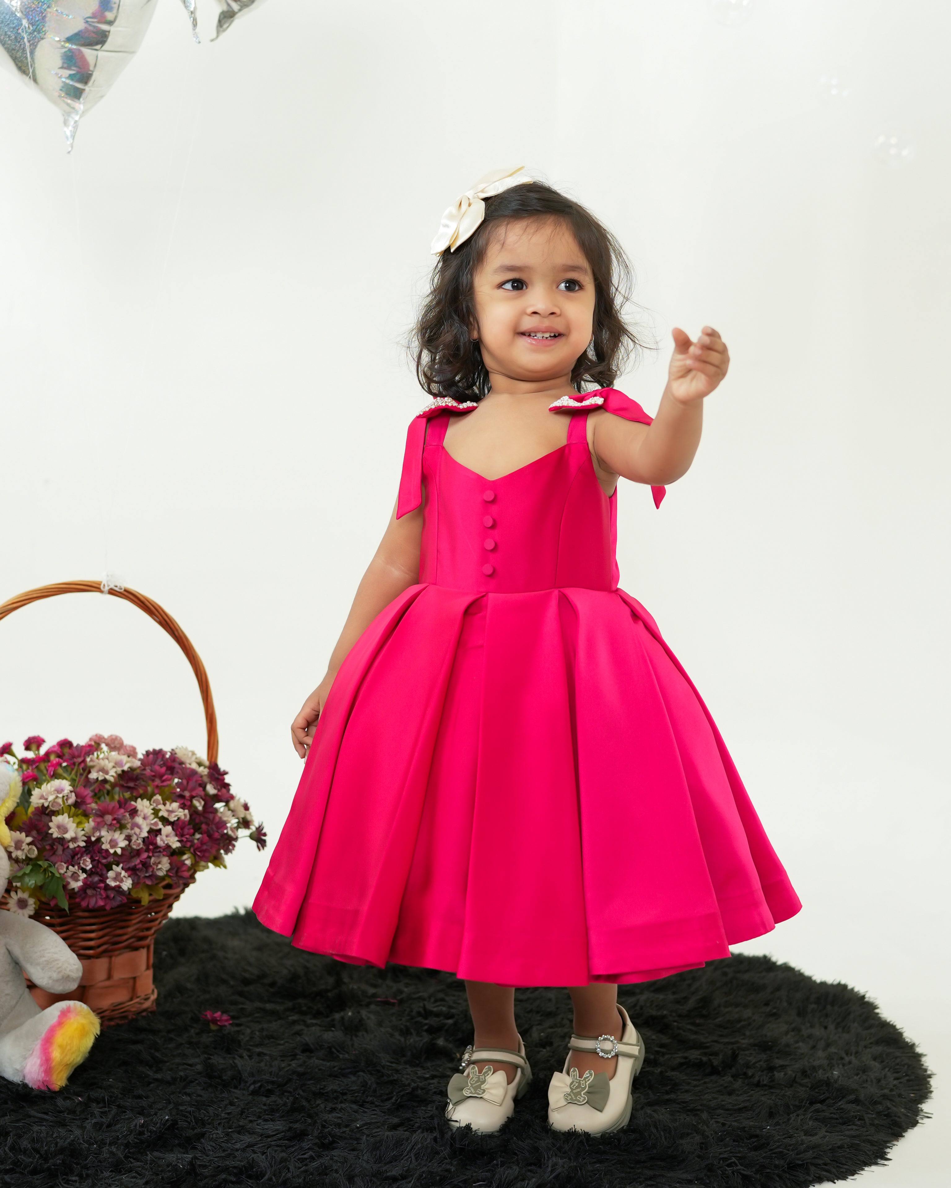 This adorable cherry red frock is a vision of sweetness and elegance, perfect for little ones to twirl and play in style. The charming design features a square, strappy yoke and a voluminous Milano satin skirt, beautifully decorated with delicate pearl hand-embroidered bows. These intricate details add a touch of sophistication, while the soft cotton lining ensures comfort and ease of wear.