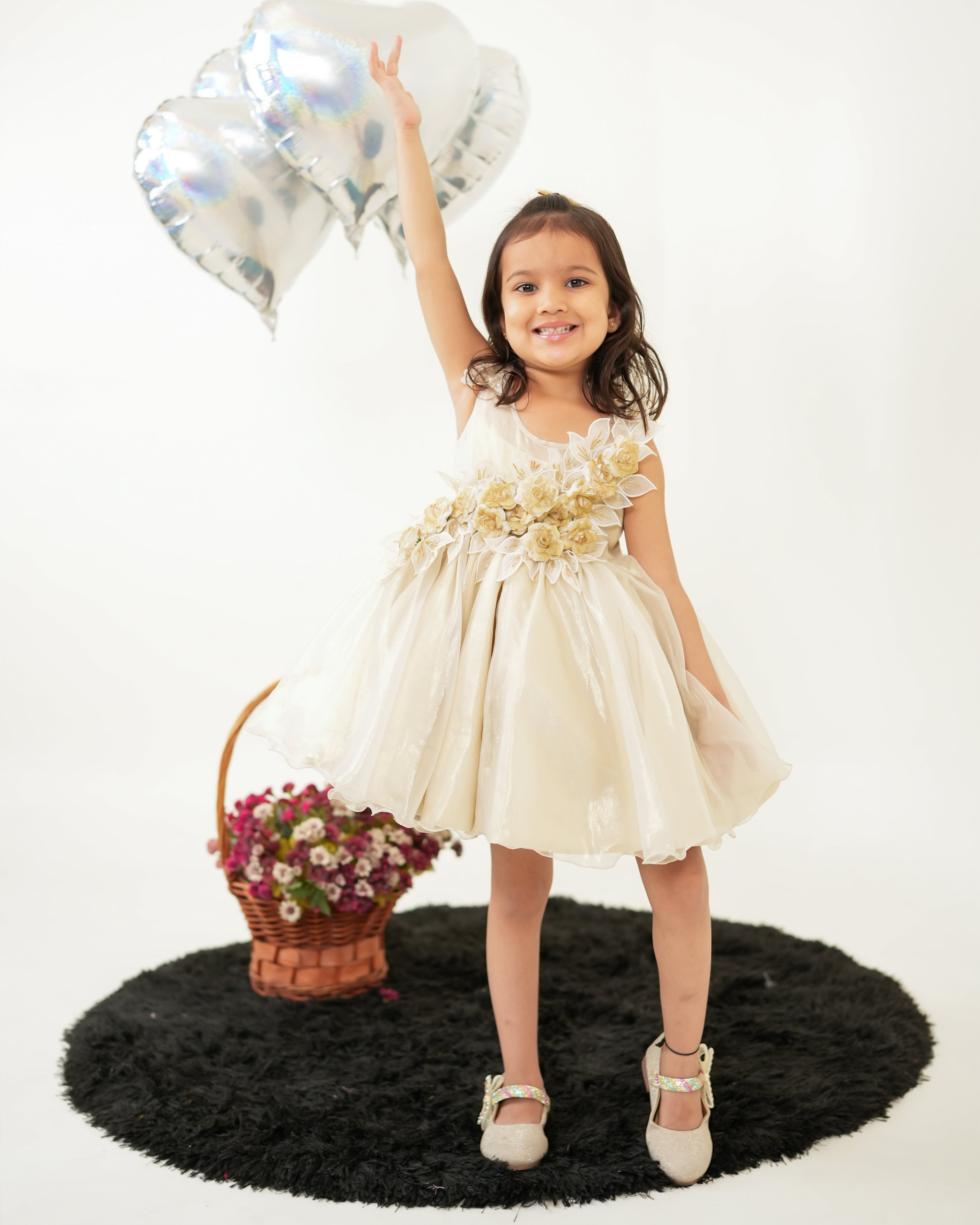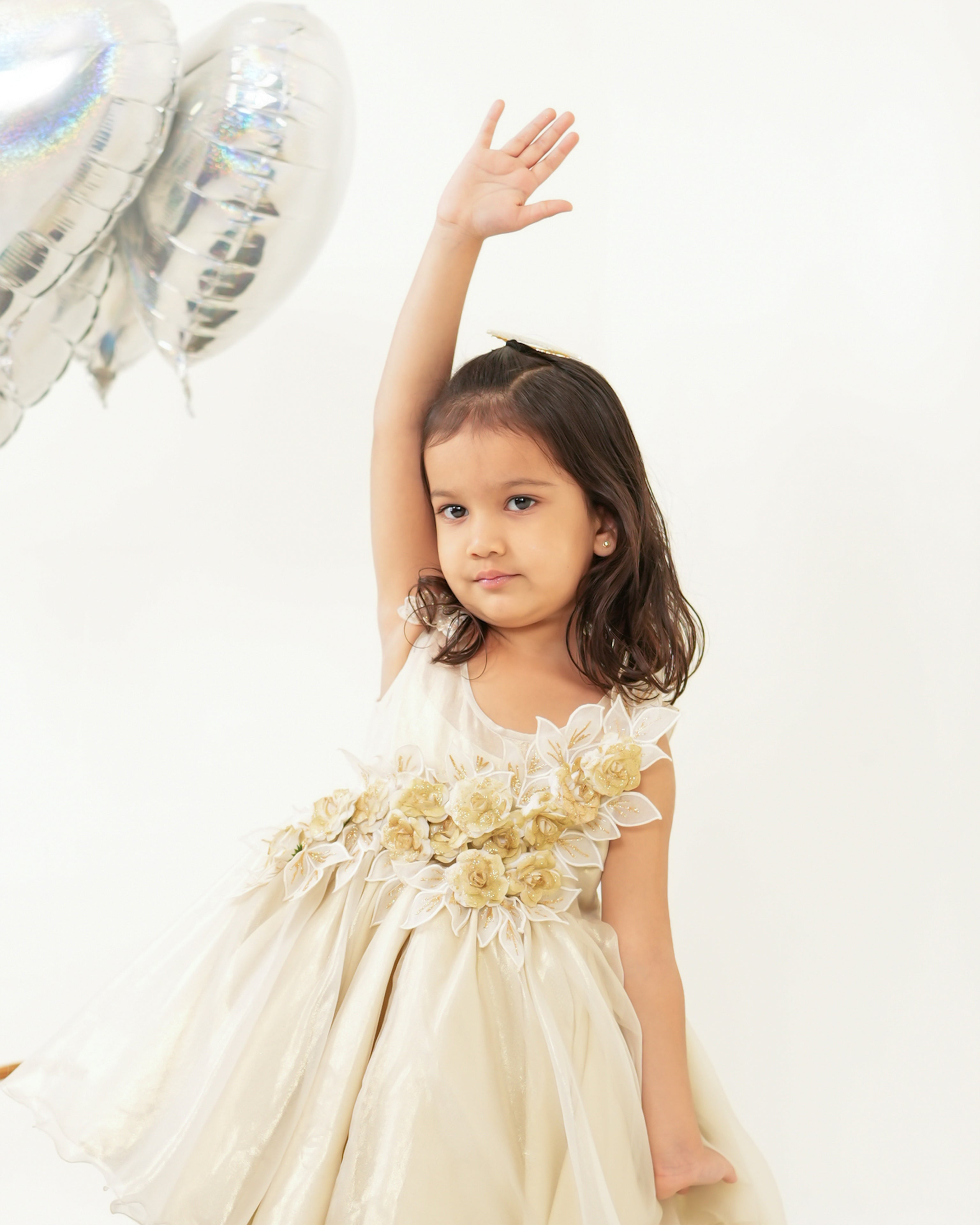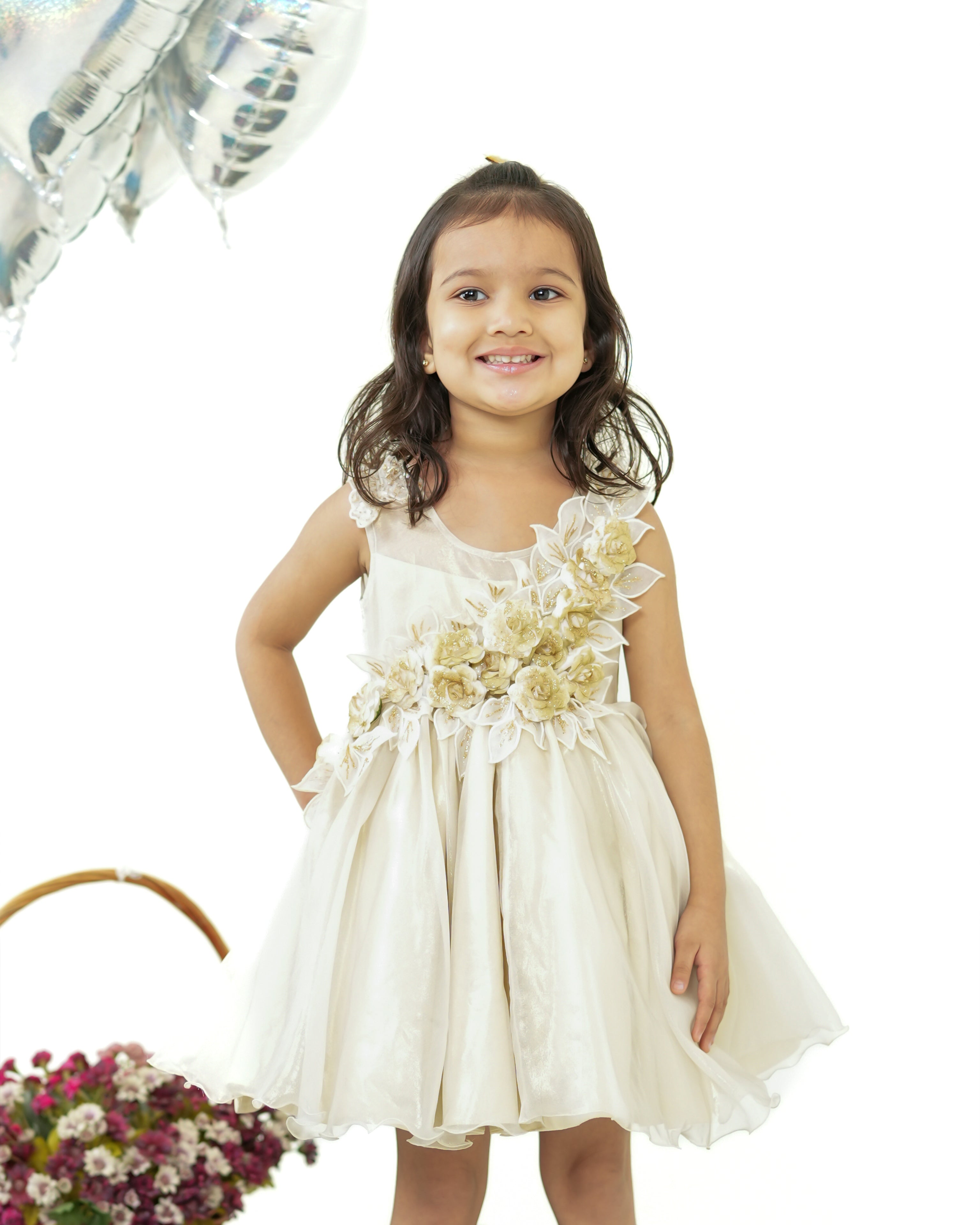 Ideal for weddings, formal portraits, and milestone celebrations, this captivating frock exudes innocence and joy. The intricate floral pattern and subtle gold accents evoke a sense of wonder, making it a treasured keepsake for years to come. With its perfect blend of whimsy and sophistication, this delightful frock ensures your little one shines on their special day.