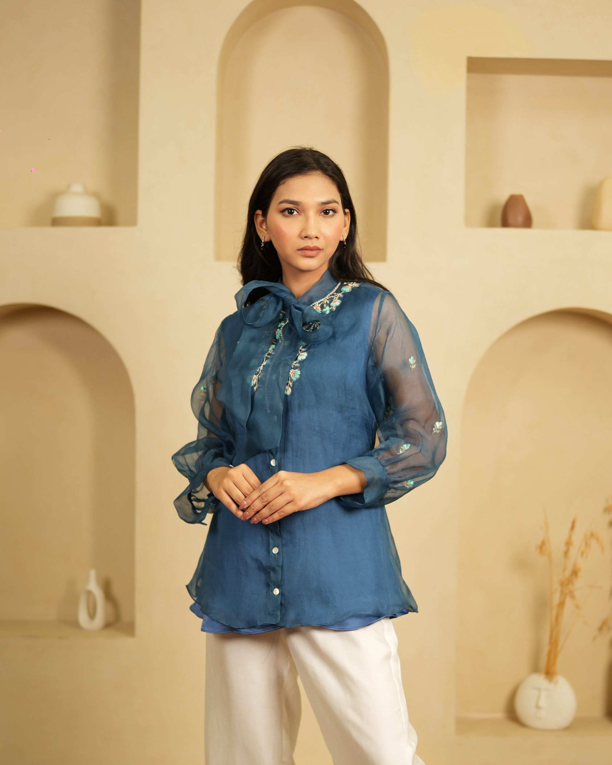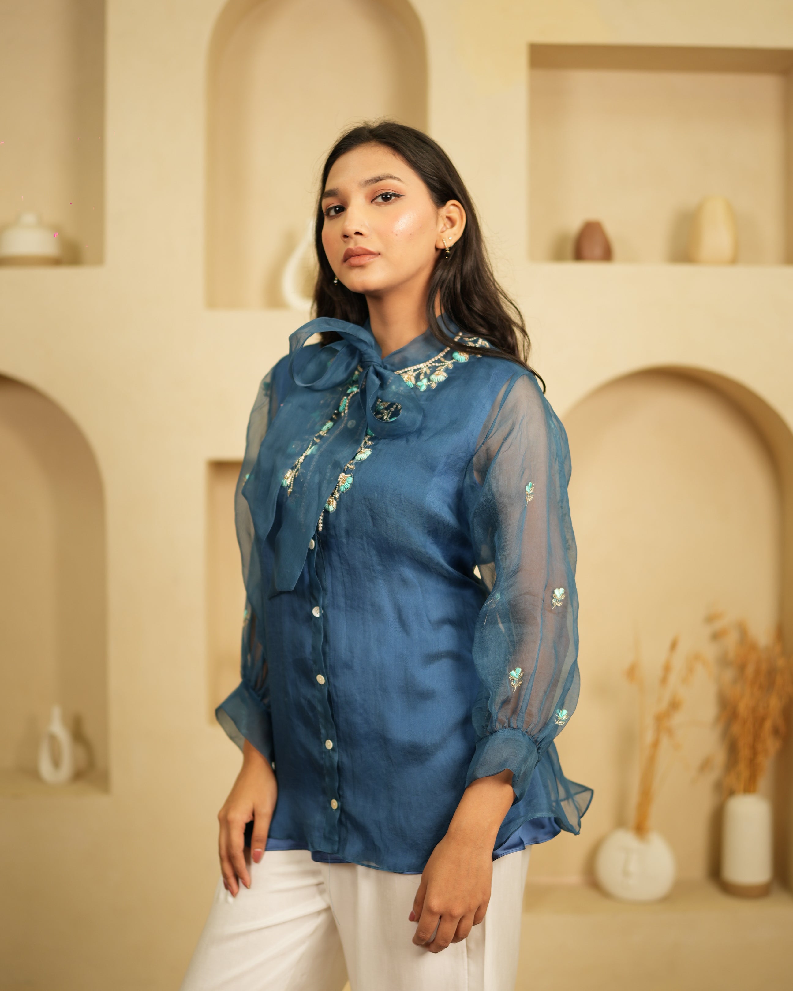 Sophisticated and striking, the Midnight Bloom co-ord set has a quiet confidence about it. The deep teal organza shirt is embroidered with scattered multicolour floral motifs and small sequin details that catch the light subtly. The look is finished with ivory satin dupion trousers that let the teal shirt truly shine.