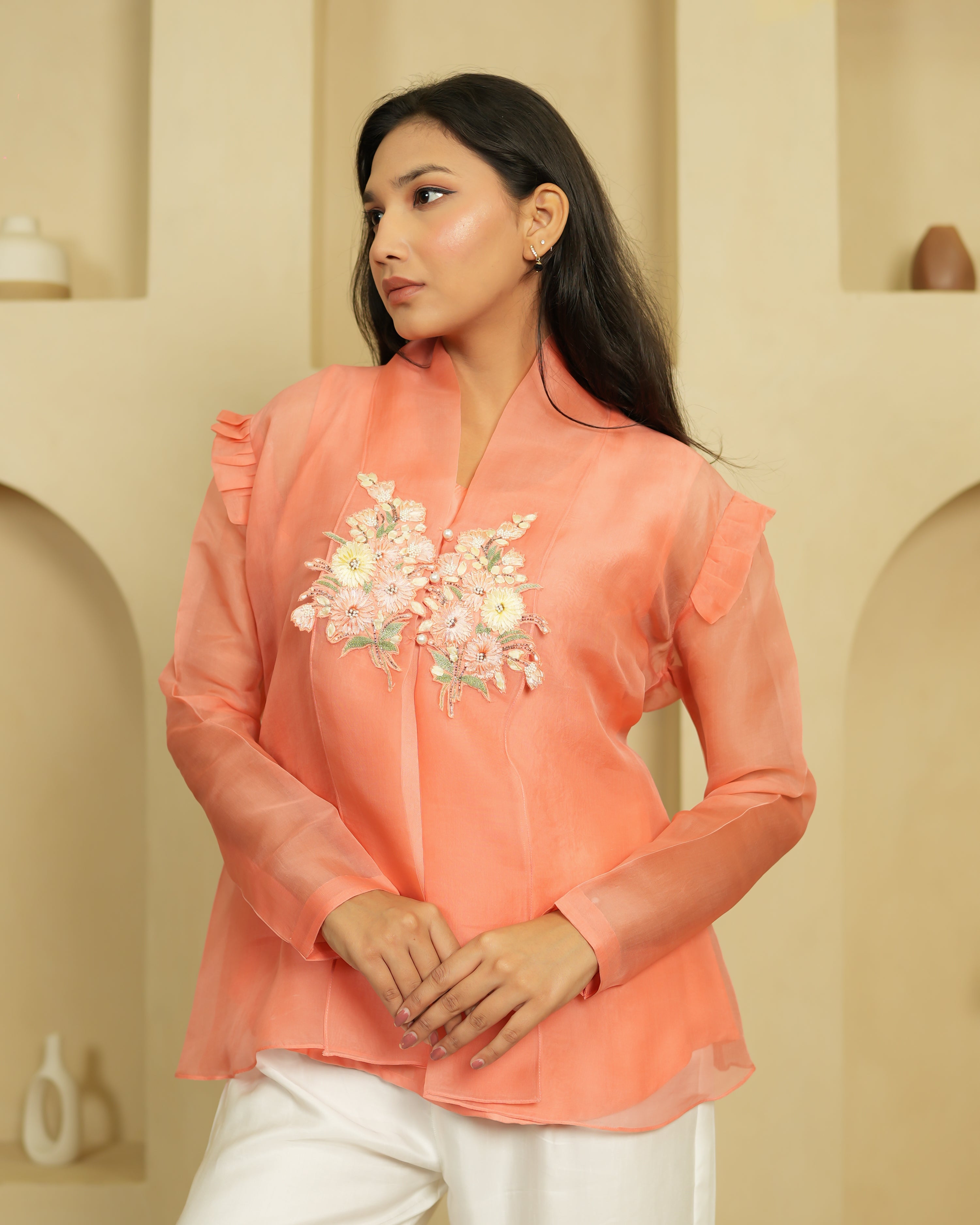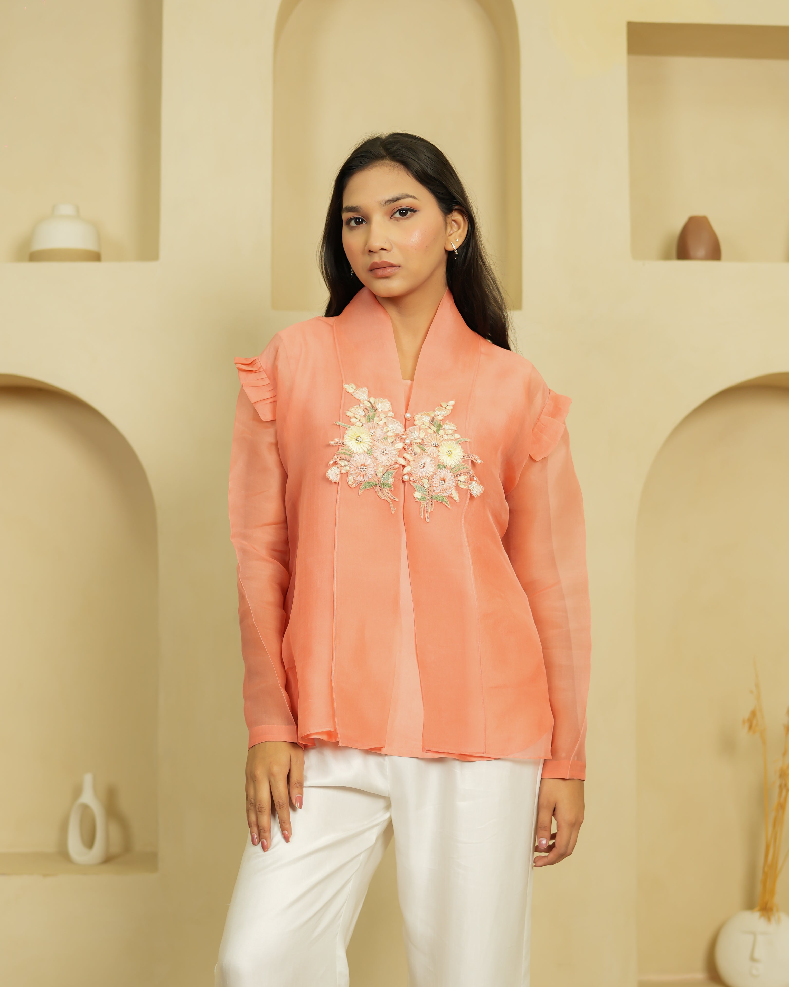 The Peach Flowret is a warm, dreamy co-ord set that's impossible to ignore. The peach organza shirt features a stunning 3D embroidered bouquet at the chest — layered blooms in soft creams, whites, and blush tones that give it a truly luxurious, handcrafted feel. It's styled with ivory satin dupion trousers that complement the warmth of the top beautifully.