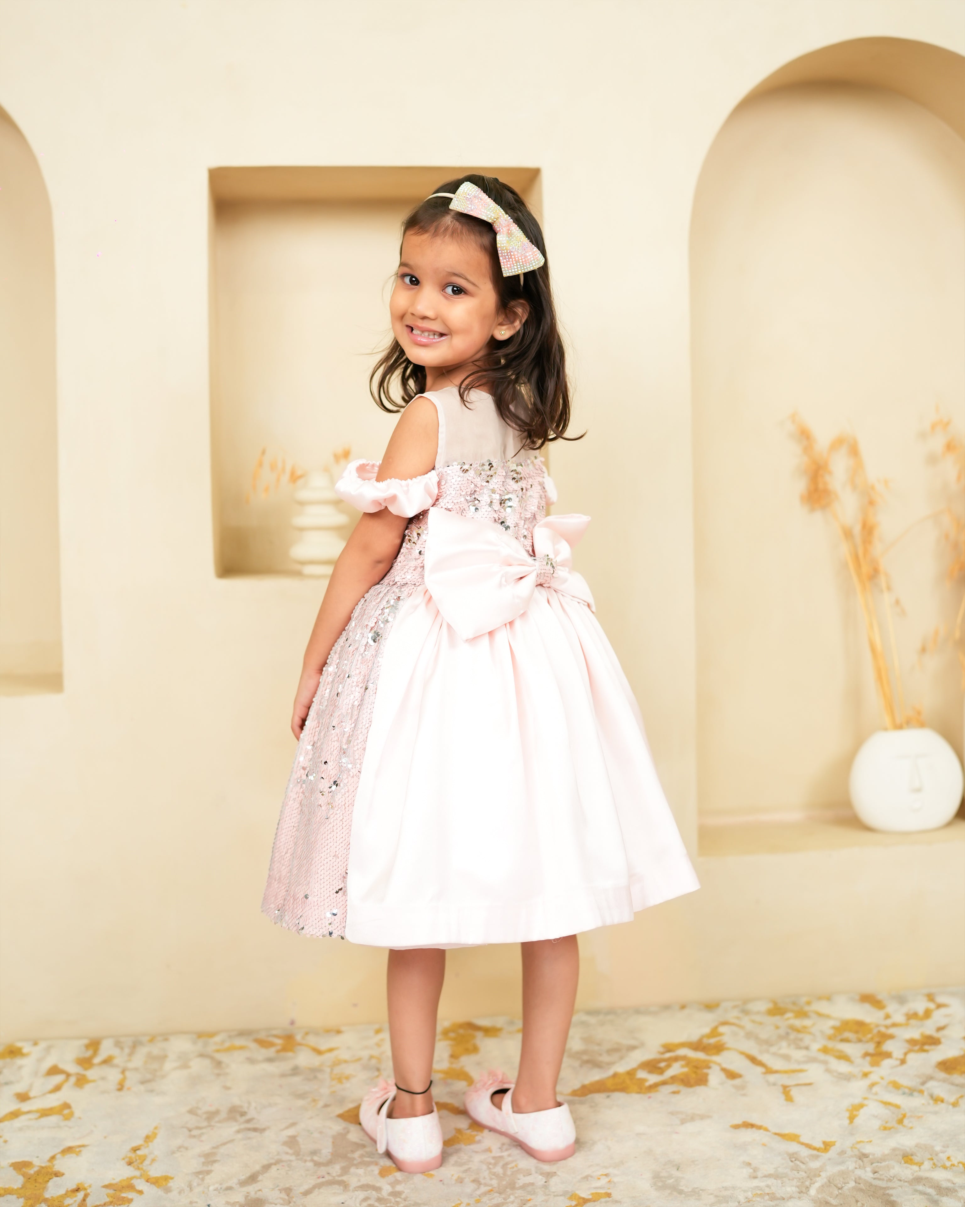 Its twirly silhouette makes it ideal for birthdays, parties, and special family gatherings, while a concealed zip allows for easy dressing and a neat finish.
