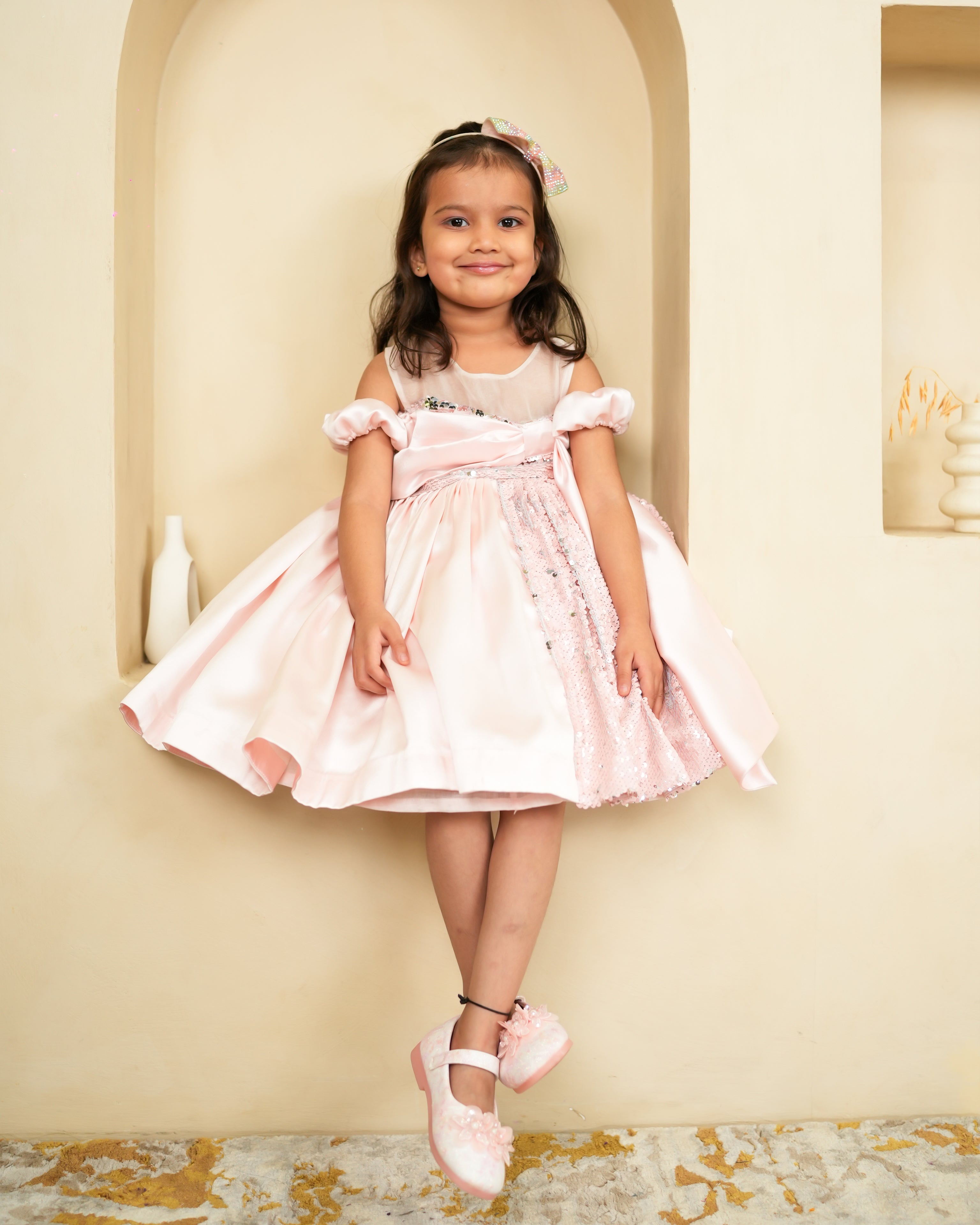 Bright, cheerful, and full of charm, the Sparkle Bloom Twirly Tutu Dress is perfect for little celebrations and memorable moments. Crafted in a soft peach shade, this dress blends elegance with playful twirls, creating a delightful look for your baby. The smooth satin fabric with a soft lining ensures comfort while keeping the dress polished and festive.